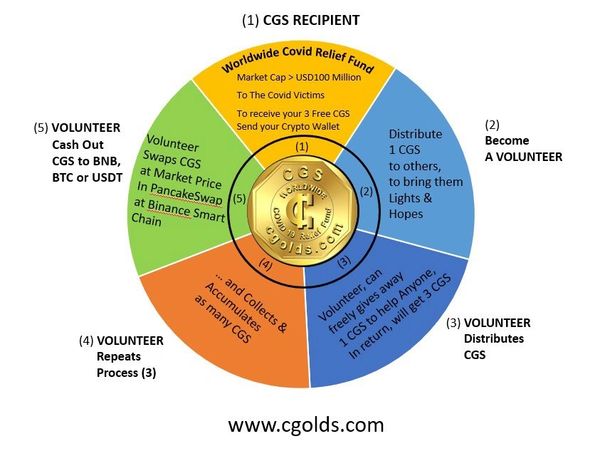 6) Each time, a Volunteer gives away 1 GCS from his / her Wallet to help bring lights and hopes to a Covid Survivor or Victim, the Volunteer, in return, will repeatedly and constantly receive 3 free CGS from this Covid Global Relief Program.